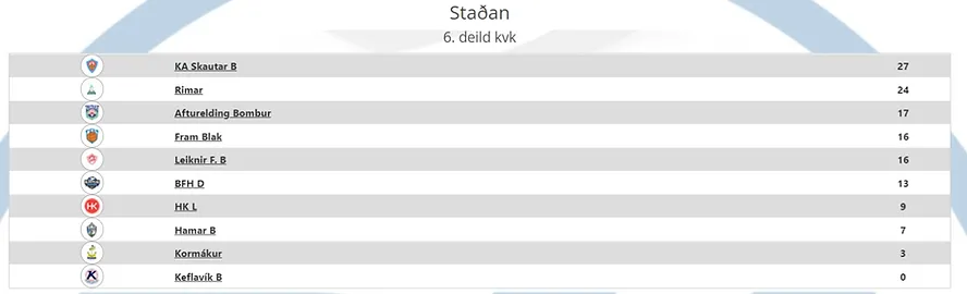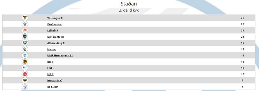 Hér að neðan má sjá stöðuna eftir eina leikna umferð í hvorri deild (bæði helgarmótin).